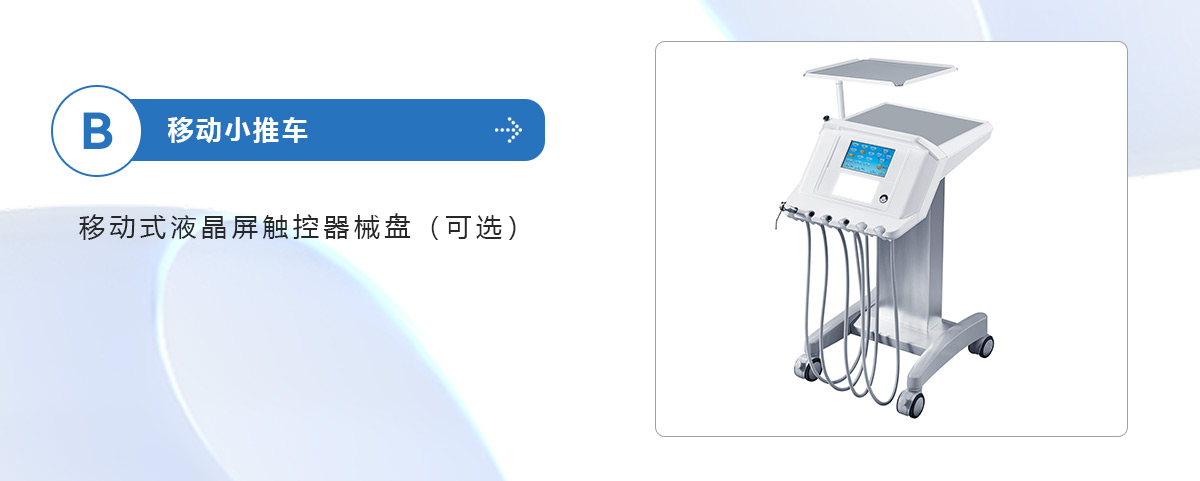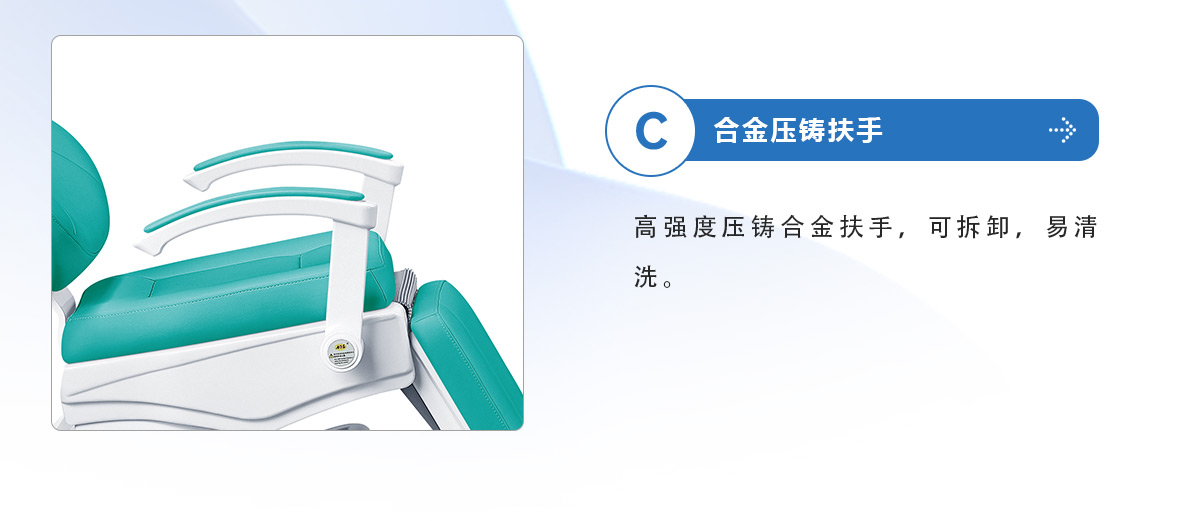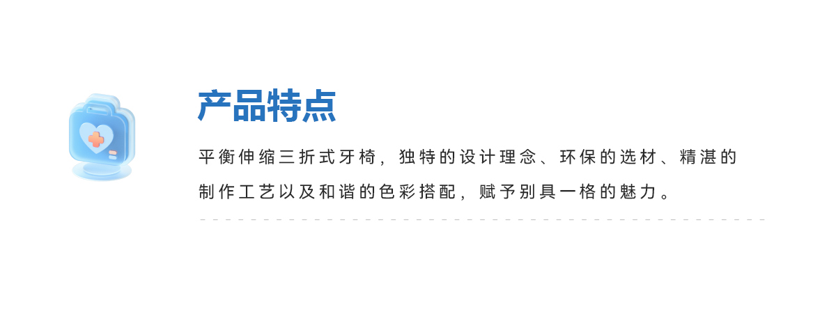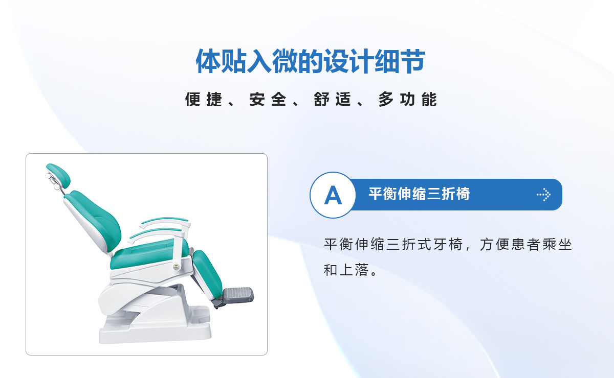 三折式牙科椅:獨特的現(xiàn)代設(shè)計理念、環(huán)保的選料、精湛的制作工藝以及和諧的的色彩搭配,賦予別具一格的魅力。
